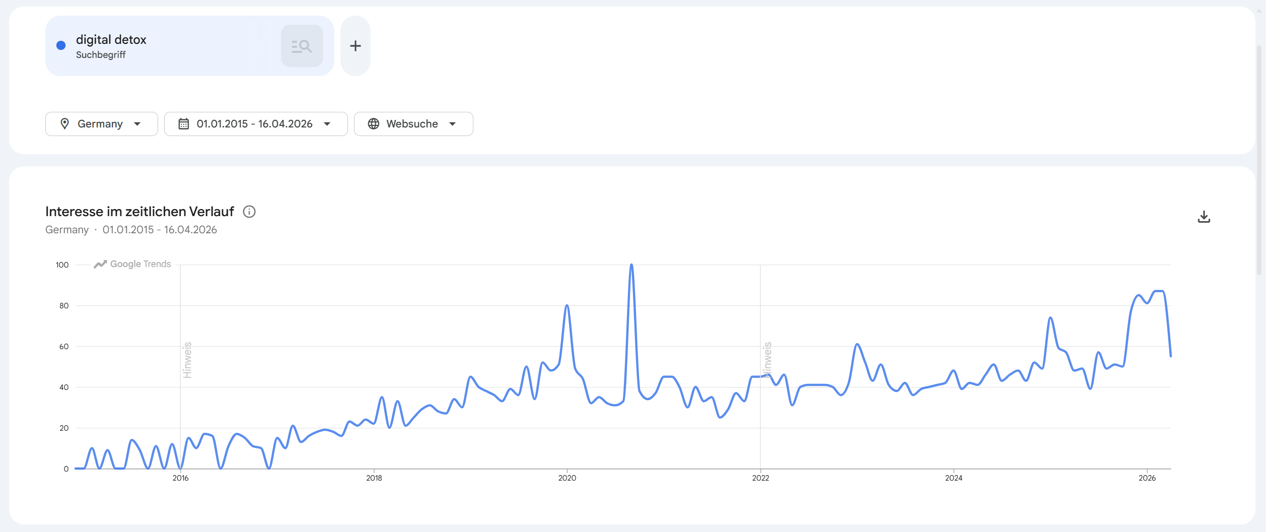 Kein Wunder, dass der Begriff “Digital Detox” laut Google Trends gerade so hoch im Kurs steht wie nie zuvor.