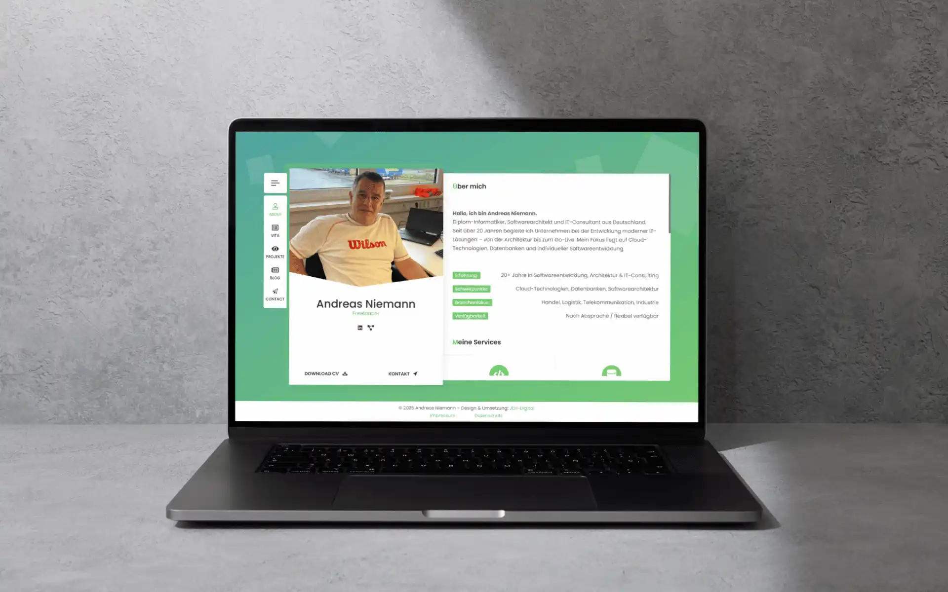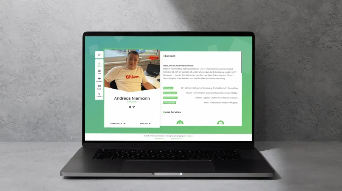 Andreas ist IT-Consultant und Entwickler. Technisch war bei ihm schon alles vorbereitet: Domain, Hosting und WordPress standen. Was noch fehlte, war ein modernes, strukturiertes Design und eine klare Präsentation seiner Inhalte: Blog, Portfolio, Skills und Vita.